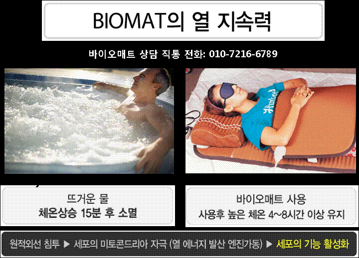 참고로 일반적인 온열요법의 경우에는 그 행위가 종료되고 난 다음 상승된 체온은 20분이 경과되면 원래 체온으로 낮아진다는 것 입니다, 이러한 실험 결과는 건강 관리와 투병 과정에서 환자의 만족도 측면에서 많은 차이점이 있습니다, 어떤 사람은 리치웨이 바이오매트와 기존의 온열 제품들이 차이가 없는 것으로 생각하고 큰 기대를 하지 않았다가 제품을 사용한 후 큰 변화를 경험하고 주변 사람들에게 제품을 소개하는 사례가 많았습니다,